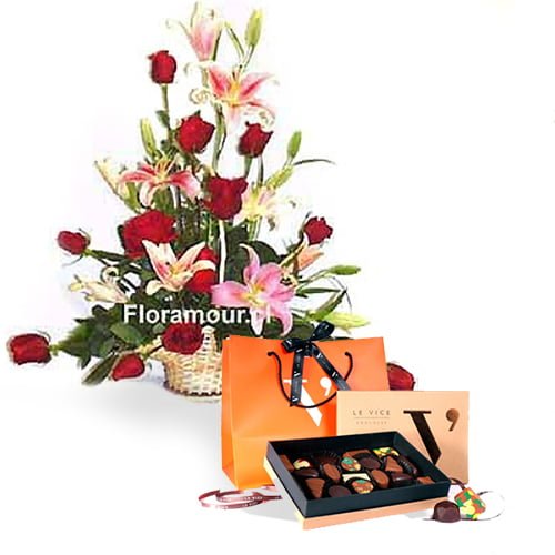 • Arreglo de rosas y liliums con bombones Le Vice de 22 Unidades
