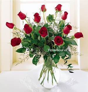 • Florero de vidrio con 12 rosas importadas y flores de complemento