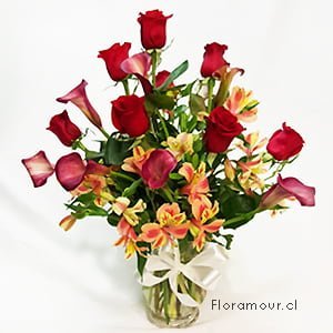• Florero de calas, rosas y alstroemerias