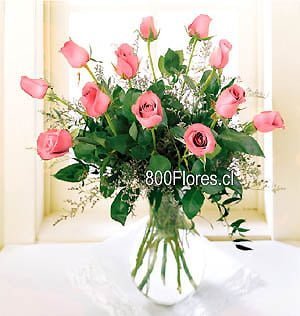 • Florero de vidrio con 12 rosas importadas y flores de complemento